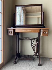 この脚をご自宅でのリモートワークで使用するデスクにリメイクするのです。ミシンについてはやはり処分をすることになりますが、ミシン屋さんが部品取り用に引き取ってくれる場合もありますし、おばあちゃんが踏んでたリズミカルな足踏みの印象が強いので、脚を残すのがいい!ということと、意匠的な良さで、脚を再利用してデスクにしたい、というご要望が多いのです。こんな感じに^^