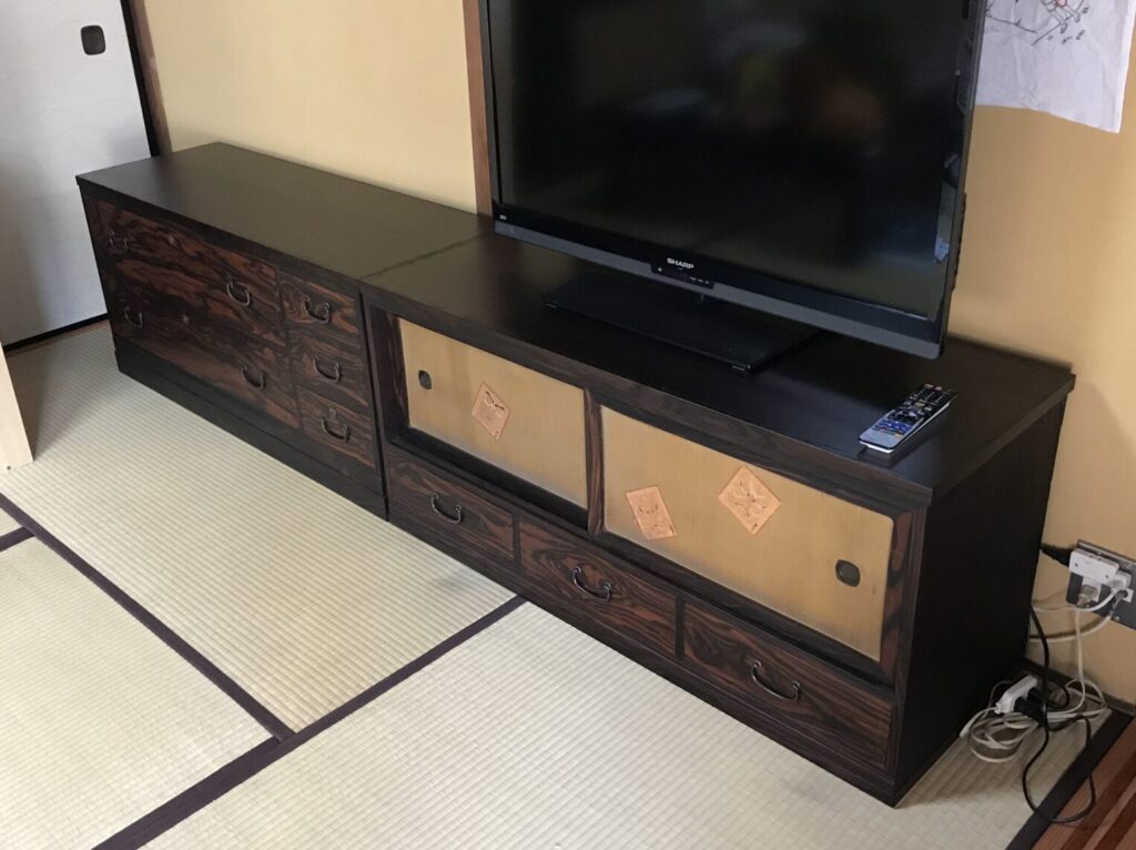 こちらは時代箪笥をローボードとしてリメイクしたものです。本来は三つ重ねの箪笥で三段になっています。二段目は盆箪笥といいまして、和服を収納する桐材のトレーのようなものが何弾も収納されている部分がありますが、そこは撤去して一番上の戸袋(とぶくろ)と、下段の整理箪笥部分を並列して設置できるよう、それぞれに天板を製作して乗せて、塗装しました。脚の部分でも高さが揃うように台輪(だいわ)も製作しています。