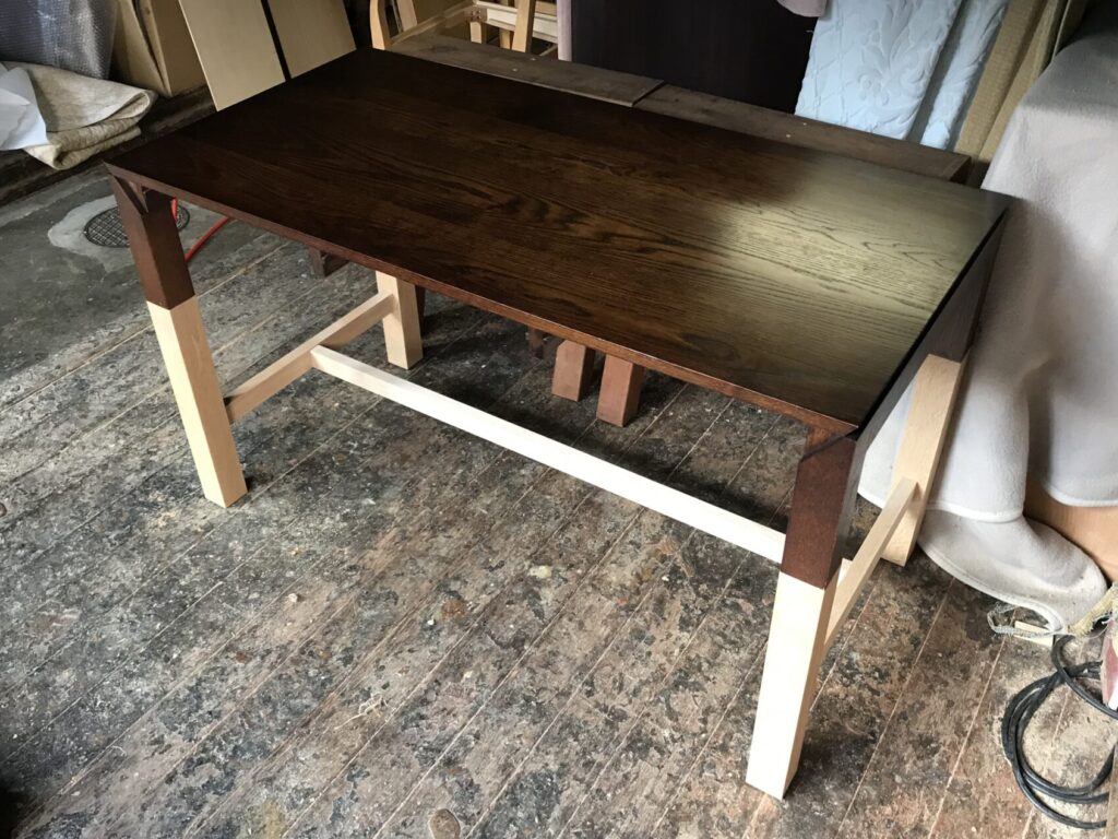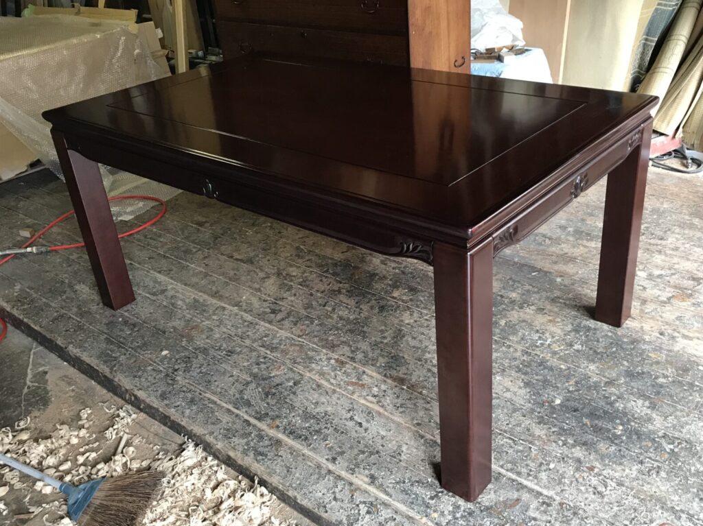 こちらは、もともと座卓でした。脱着出来る脚でしたのでラッキーでしたが、元の脚と同じ構造の、長い脚を、近い材(かば桜)で製作し、塗装を色合わせしてリメイクいたしました。