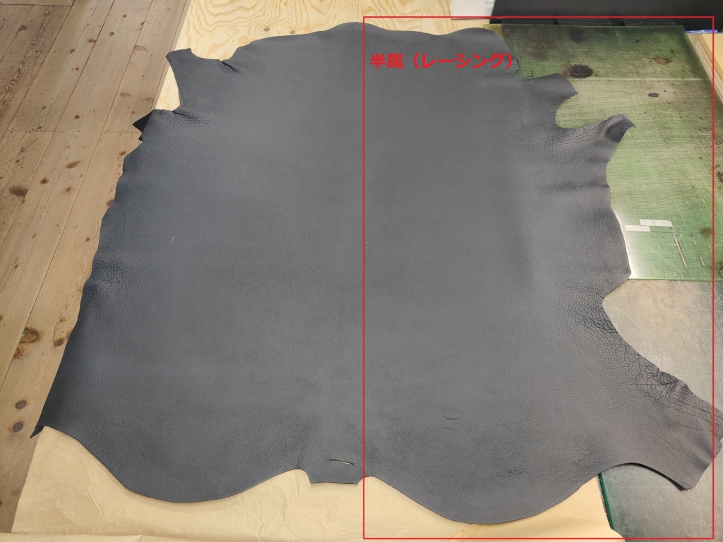 「ああ、確かに牛ですね」という形をしています。家具用皮革は通常この牛の半身分を半裁として仕入れることになります。(食卓椅子の座面に使ったりもするため、半裁ずつの方が、需要に合わせて流通させやすいからではないかと推察しております。)